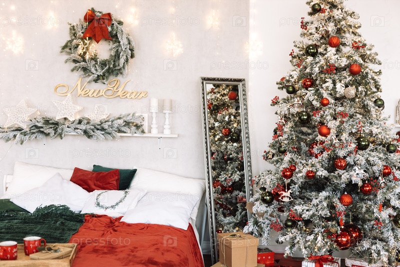 Уютная сцена спальни для отдыха с красиво украшенной рождественской елкой, праздничным венком и теплыми текстилями, создавая радостную атмосферу для сезонных торжеств
