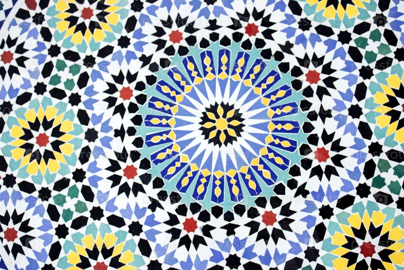 Цветные геометрические мозаичные узоры со сложными рисунками в синем, желтом, зеленом и красном цветах создают яркий визуальный дисплей с культурной значимостью и художественным выражением