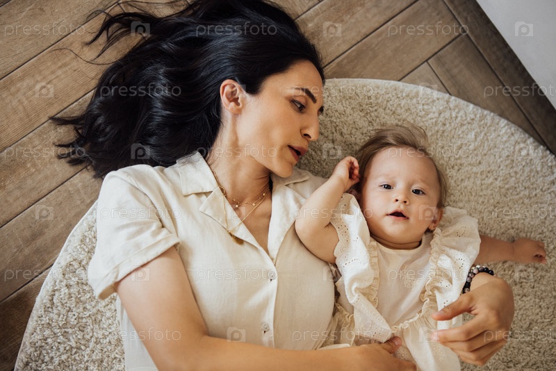 Мать и ребенок лежат на мягком ковре, разделяя нежный момент с естественным светом, освещающим уютное внутреннее пространство, показывая любовь и связь