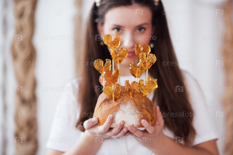 Молодая женщина с длинными коричневыми волосами держит красиво украшенный ломтик хлеба, увенчанный золотыми ювелирными изделиями в форме сердца, демонстрируя творчество и кулинарное мастерство в яркой, приглашающей обстановке