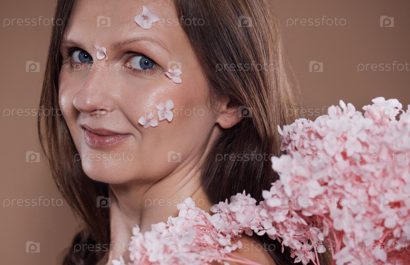 Женщина с длинными коричневыми волосами, украшенные розовыми цветочными лепестками, уверенно смотрит в камеру, демонстрируя красоту и природу в мягком художественном портрете с цветковыми элементами