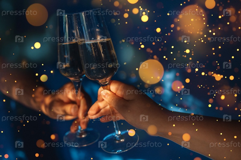 Люди празднуют и поднимают чашки с пенным вином на темно-синем фоне