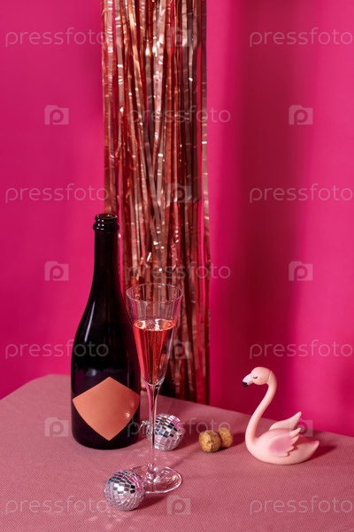 Бутылка шампанского и заполненный стакан, а также фигура розового фламинго на ярко-розовом фоне