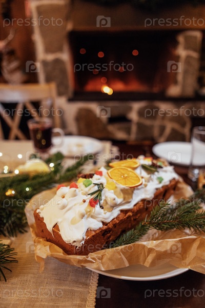 Вид на вкусный рождественский торт с кондированными фруктами, апельсином и пряностями. Новогодние украшенные выпечки на крытом праздничном столе. Камин и уютный интерьер дома