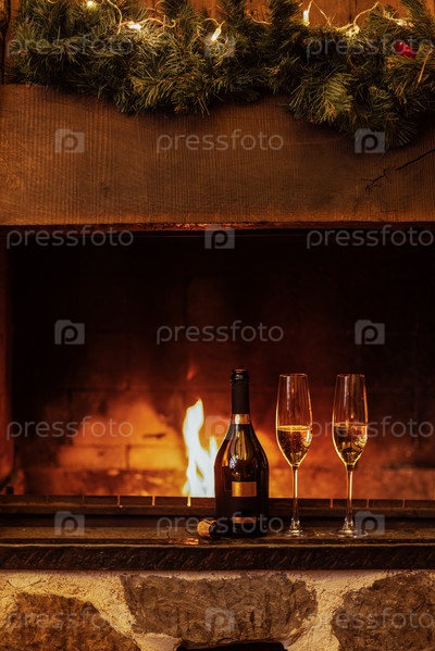 Два бокала шампанского на камине, бутылка газированного вина и чашка возле открытого огня, рождественская вечеринка или романтическая встреча
