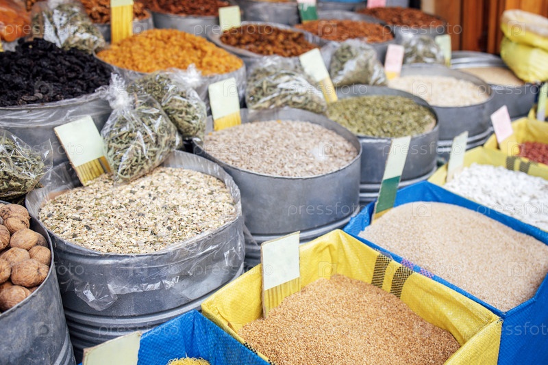 Красочный ассортимент специй и трав, представленных в металлических контейнерах и плетеных корзинах на оживленном рынке, демонстрируя разнообразные кулинарные ингредиенты и текстуры для любителей кухни