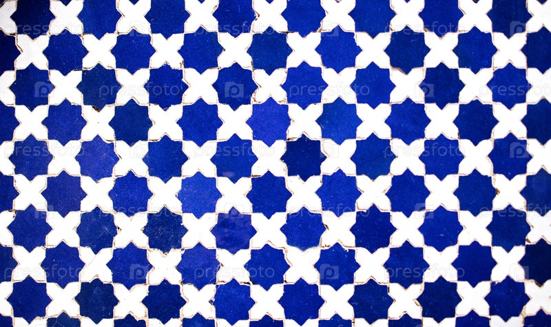 Замысловатый рисунок синих и белых плиток с геометрическими формами и звездными мотивами, показывающими традиционное мастерство и яркие цвета в декоративном дизайне