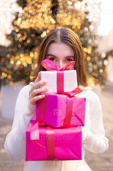 Молодая девушка с рождественскими подарками на улице. подросток в белом свитере держит розовые коробки с лентами и лучами. студент с рождественскими подарками