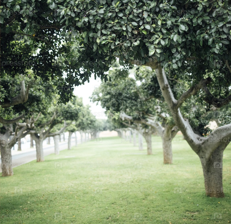 Густозеленые деревья строят спокойный путь в тихом парке, создавая мирную атмосферу с яркими листьями и мягкой травой под ногами, приглашая к расслаблению и исследованию