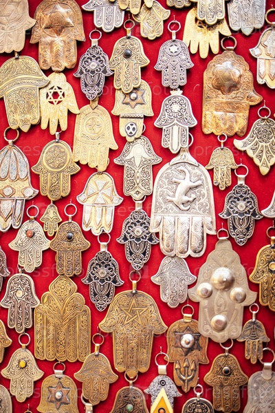 Сложная коллекция металлических амулетов ручной формы, выставленных на ярко-красной ткани, демонстрирующих культурное мастерство и элементы художественного дизайна в декоративной композиции