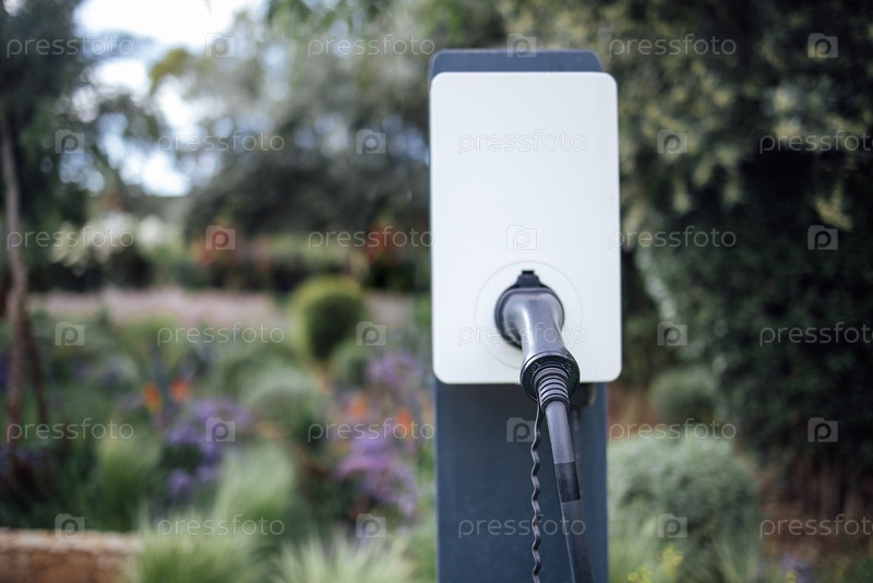 Зарядная станция для электромобилей с черным кабелем зарядки в пышной садовой среде, окруженная яркими цветами и зеленью, способствуя устойчивым энергетическим решениям