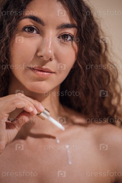 Молодая женщина с кудрявыми волосами наносит сыворотку на свою кожу, демонстрируя привычку красоты в спокойной обстановке, подчеркивая ритуалы самообслуживания и ухода за кожей для здорового телосложения