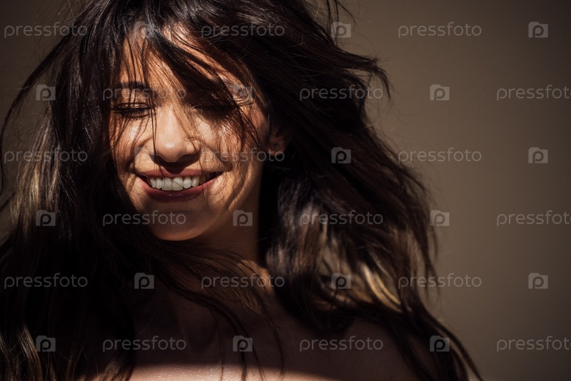 Улыбающаяся женщина с дрожащими волосами, освещенная мягким светом, демонстрируя радостное выражение и естественную красоту в спокойной обстановке, захватывая сущность счастья и тепла