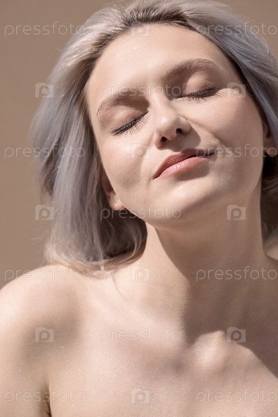 Молодая женщина с светлыми волосами, закрытыми глазами, наслаждающаяся солнечным светом на своем лице, показывая естественную красоту и спокойствие в безмятежной атмосфере, подчеркивая расслабление и самообслуживание