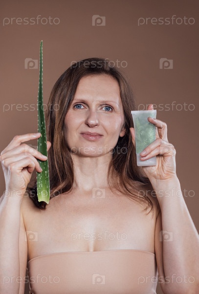 Женщина держит свежий лист алоэ вера и контейнер с гелем, демонстрируя естественные преимущества ухода за кожей, подчеркивая здоровье и красоту в минималистической обстановке с теплыми тонами