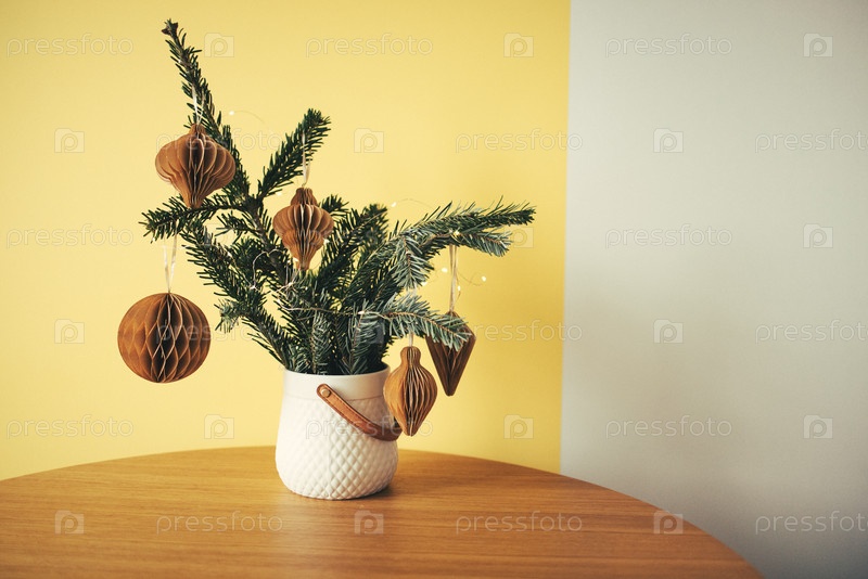 Праздничное расположение вечнозеленых ветвей в текстурированной белой вазе, украшенной деревянными ювелирными изделиями и размещенной на круглом деревянном столе напротив ярко-желтой стены, создает веселую праздничную атмосферу