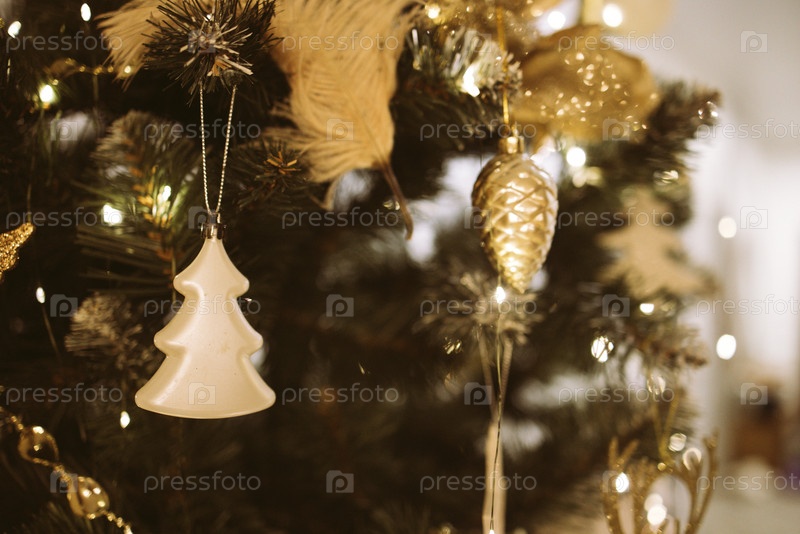 Белая керамика Украшение рождественской елки, висящей на украшенной вечнозеленой елке, в окружении золотых орнаментов и теплых огней, создавая праздничную атмосферу праздника