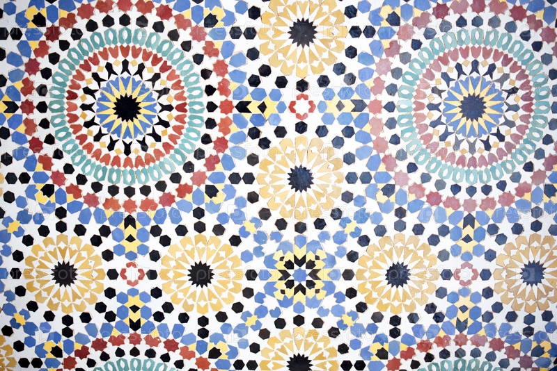 Красочный геометрический рисунок плитки со сложными круглыми структурами в ярких оттенках красного, желтого, зеленого и синего цветов, показывающих традиционное мастерство и художественное выражение