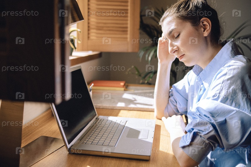 Усталая молодая женщина закрывает глаза и сидит перед компьютером