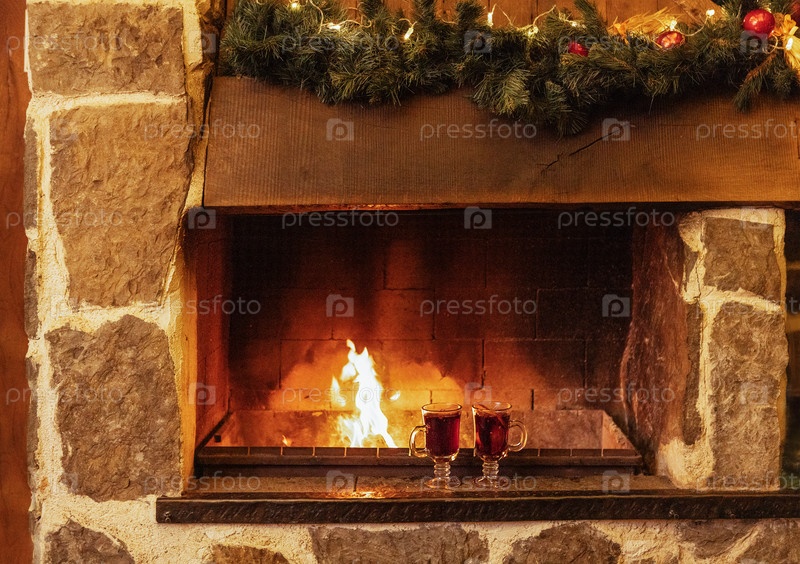 Рядом с камином два бокала горячего вина. Рождественские украшения и чашки с горячим напитком. Открытый огонь и каменные стены. В канун Нового года
