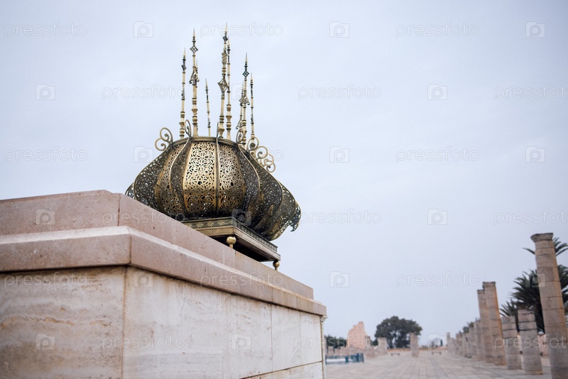 Декоративная золотая корона со сложными узорами опирается на каменный пьедестал, окруженный древними руинами и облачным небом, символизирующим историческое значение и культурное наследие