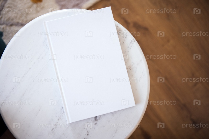 Белая бумажка твердой обложки, помещенная на круглый мраморный стол и показывающая минималистский дизайн с натуральным деревянным полом в фоне, идеально подходит для креативных презентаций