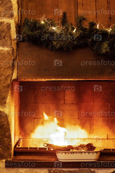Уютный камин, украшенный праздничной зеленью и мерцающими огнями, показывает вкусное блюдо в керамической таре, создавая теплую и гостеприимную атмосферу для праздничных собраний