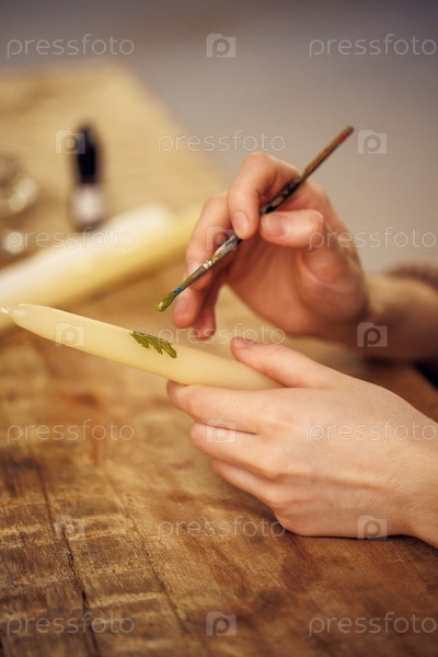 Руки творческого человека рисуют сложные зеленые чертежи на белой свече, демонстрируя художественное мастерство и внимание к деталям в уютной рабочей среде