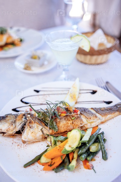 На гриле вся рыба подается на белой тарелке с красочными овощами, обтянутой травами и куском лимона в сопровождении освежающего напитка в яркой столовой атмосфере
