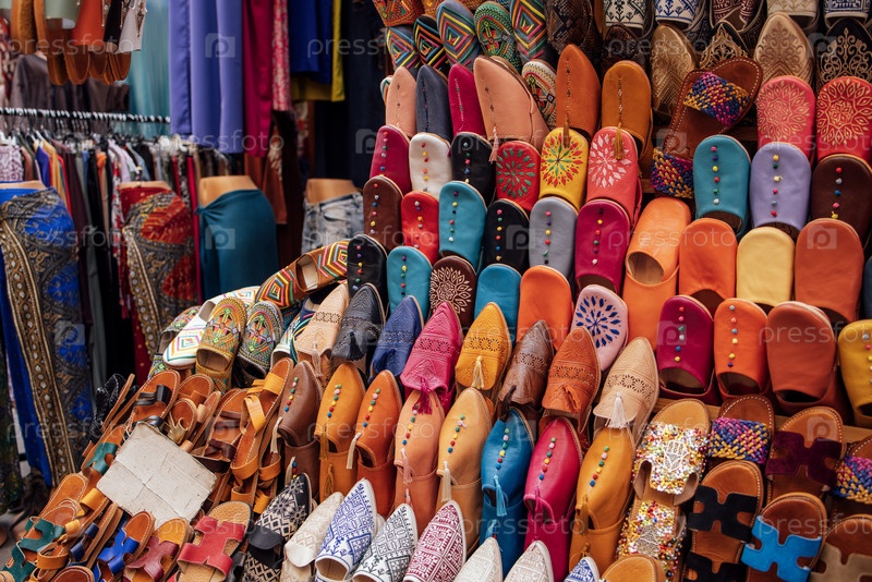 Красочная коллекция обуви ручной работы, представленная в оживлённой рыночной обстановке, демонстрирующая сложные дизайны и текстуры, идеально подходит для любителей моды и исследователей культуры