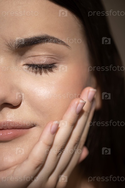 Близкий план молодой женщины с натуральным макияжем, нежно прикасающейся к ее лицу, показывая здоровую кожу и спокойное выражение лица, подчеркивая красоту и самообслуживание
