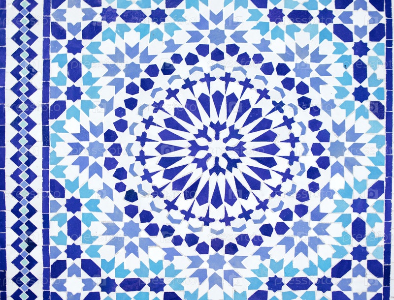 Замысловатый сине-белый геометрический рисунок черепицы с круглыми мотивами и звездами, демонстрируя традиционное мастерство и художественный дизайн в ярком декоративном стиле