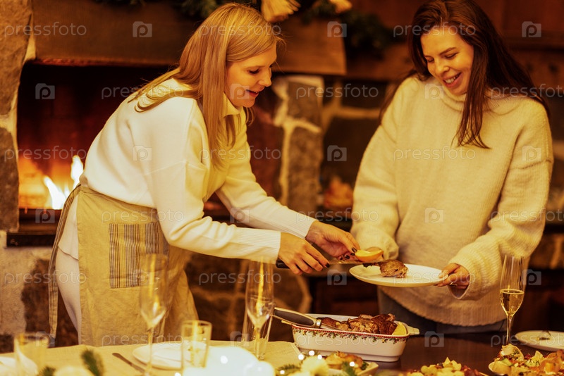 Красивые девушки в свитерах улыбаются и кладут мясо на тарелки