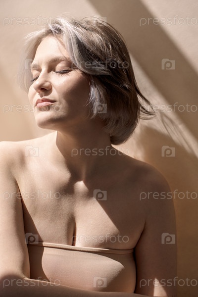 Женщина с короткими серебристыми волосами греется под теплым солнечным светом, глаза закрыты, демонстрируя спокойное выражение и мягкие тона кожи, подчеркивая естественную красоту и спокойствие