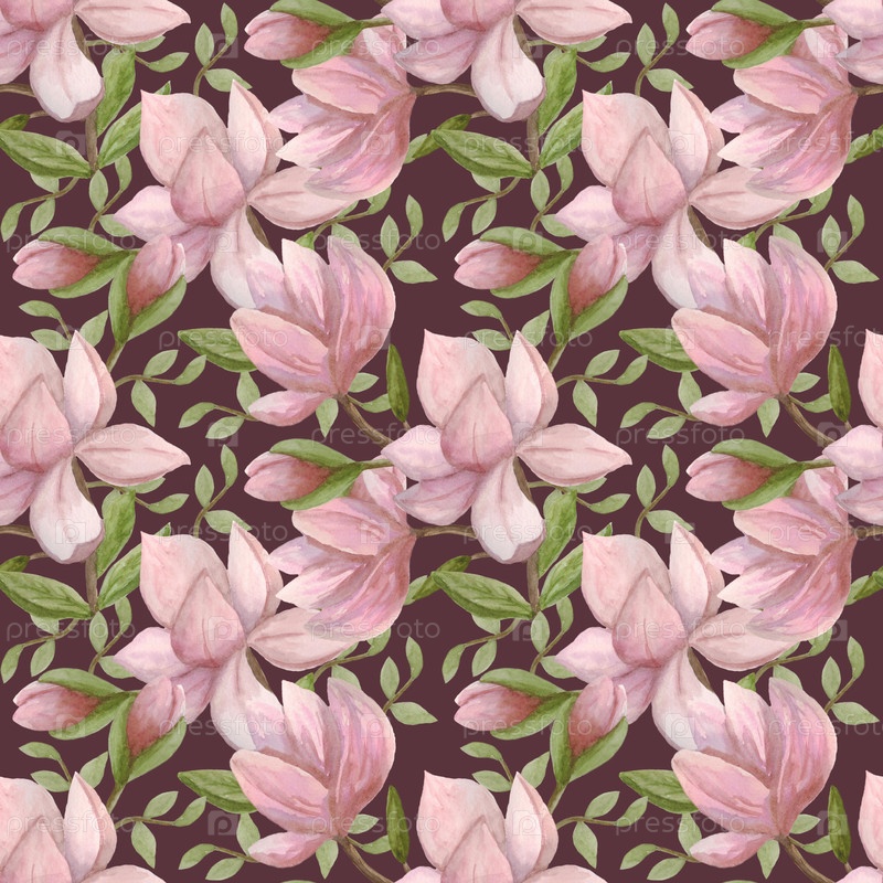 Бесшовный рисунок с цветами и листьями магнолии на коричневом фоне. Иллюстрация нарисована вручную акварелью. Может использоваться для ткани, открыток, красивых оберточек, упаковочной бумаги