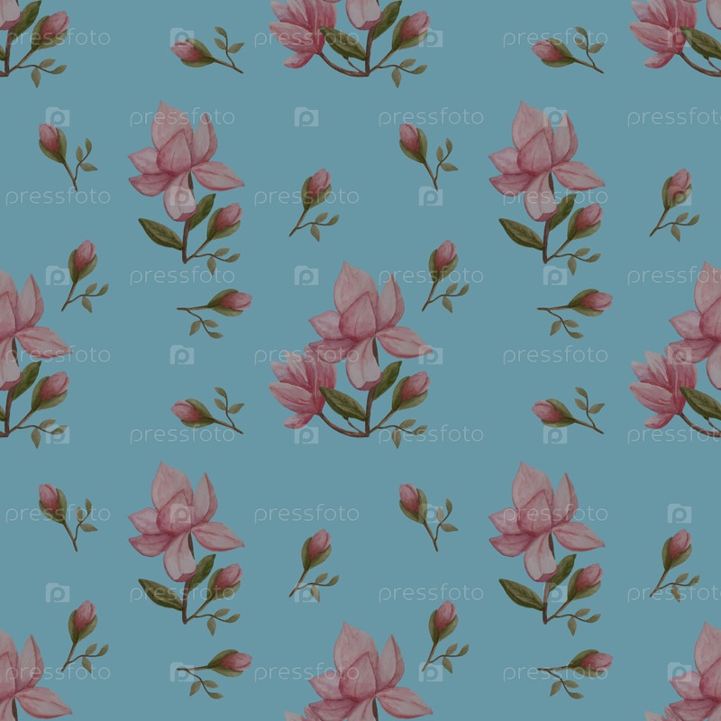Бесшовный рисунок с цветами магнолии на синем фоне.Дизайн в акварели.Может использоваться для ткани, одежды, открыток, красивых оберточек