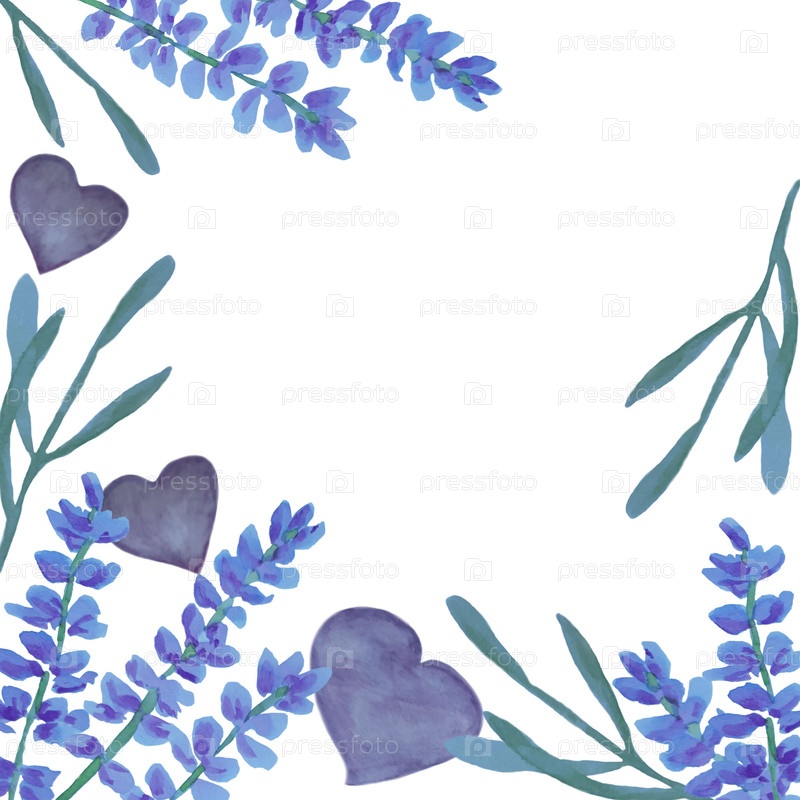Рамка с лавандой и сердцами на белом фоне. Дизайн с пустым пространством для текста. Иллюстрация сделана акварелью