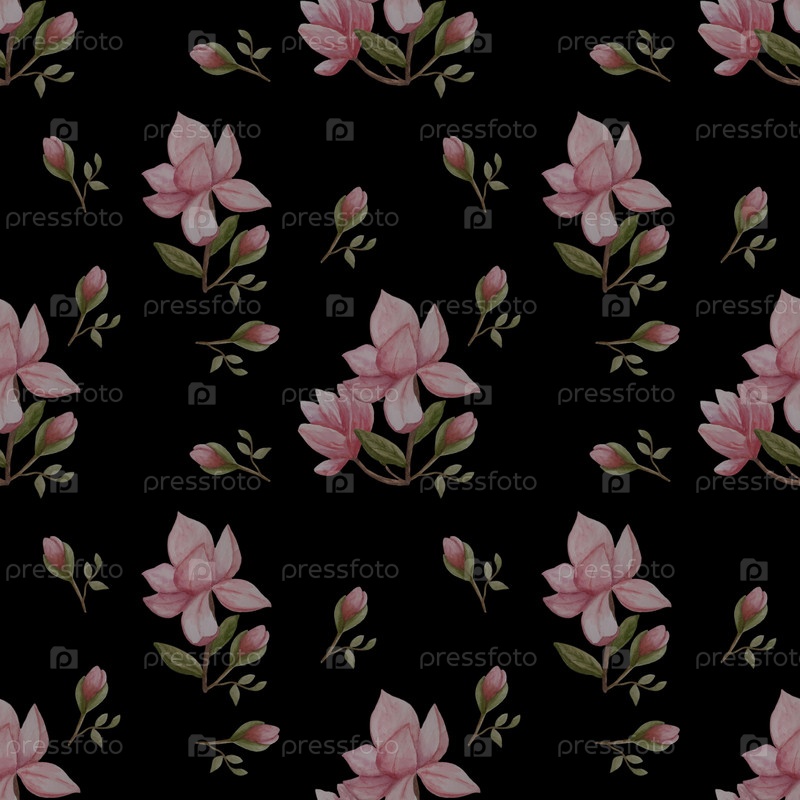 Бесшовный рисунок с магнолией на черном фоне.Дизайн выполнен в акварелях