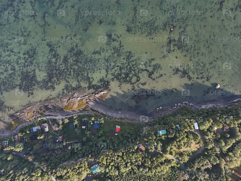 Вид с воздуха на береговую линию Национального парка Бик, лес, кемпинг и спокойную бухту под голубым небом
