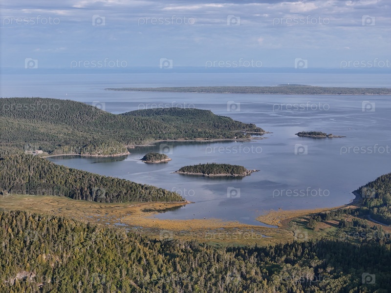 Вид с воздуха на береговую линию Национального парка Бик, лес, кемпинг и спокойную бухту под голубым небом