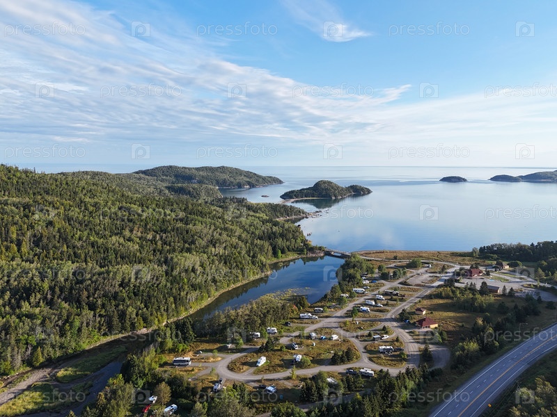 Вид с воздуха на береговую линию Национального парка Бик, лес, кемпинг и спокойную бухту под голубым небом