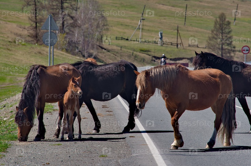 Яломан, Россия.Западная Сибирь, Алтайские горы.4 мая 2025 года.Алтайские лошади мирно пасутся на обочине дороги без страха перед автомобилями на Чуйском шоссе