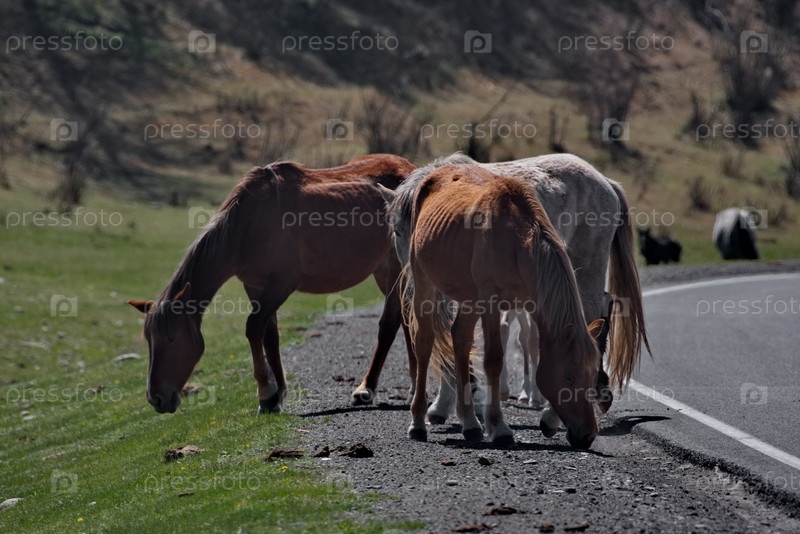 Яломан, Россия.Западная Сибирь, Алтайские горы.4 мая 2025 года.Алтайские лошади мирно пасутся на обочине дороги без страха перед автомобилями на Чуйском шоссе