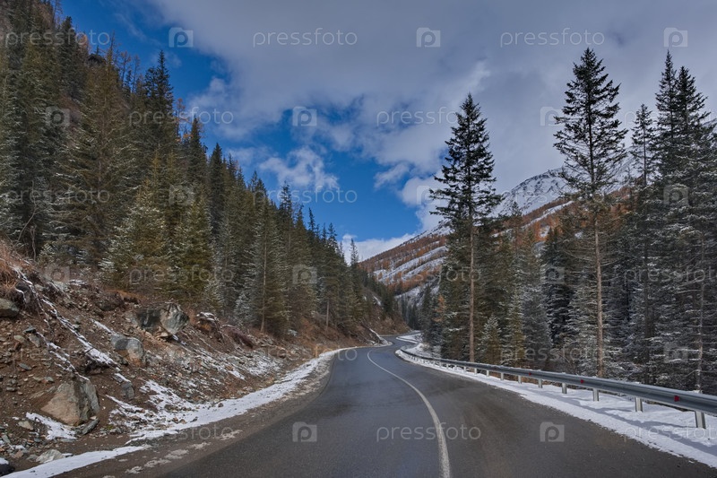 Осенний вид автомагистрали Акташ-Улаган в долине реки Чибитка между горами и заснеженной тайгой