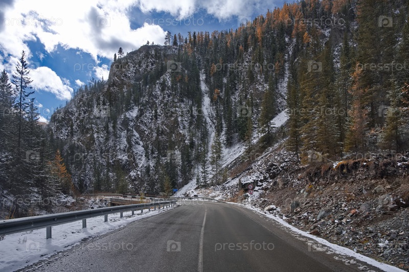 Осенний вид автомагистрали Акташ-Улаган в долине реки Чибитка между горами и заснеженной тайгой