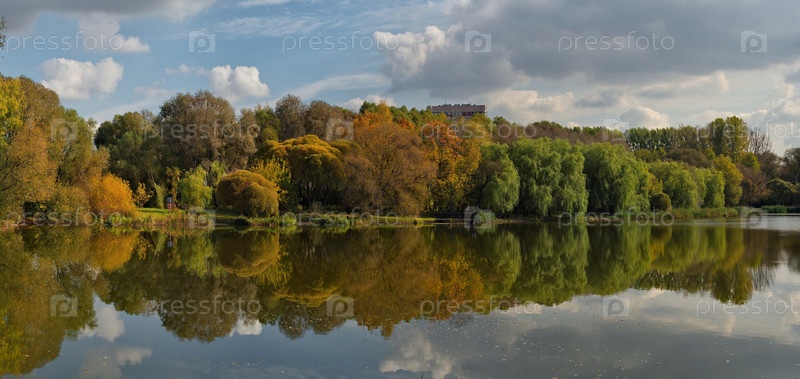 Осенний вид на озеро с желто-красными вербами и кленовыми деревьями в городском парке