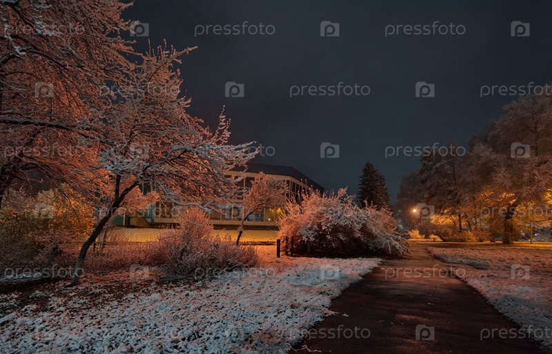 Новокузнецк, Россия. 1 ноября 2024. живописный вид на деревья городского парка, покрытые первым осенним снегом и освещенные фонарями с теплым и холодным светом