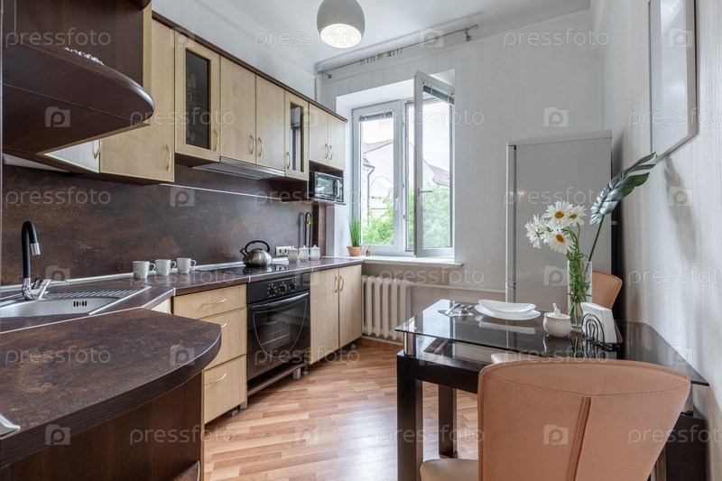 Современный яркий кухонный интерьер с деревянными шкафами, стеклянным обеденным столом, открытым окном и уютной атмосферой естественного дневного света