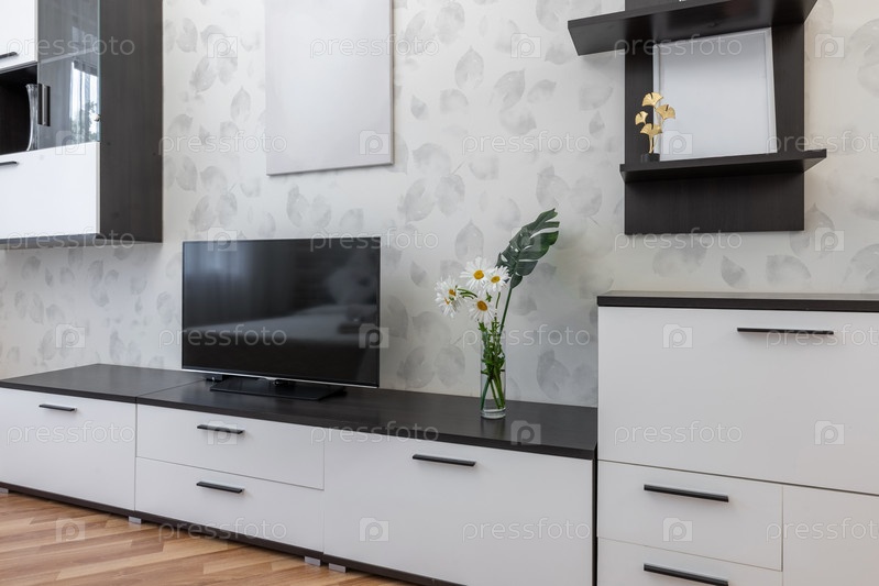 Яркая современная гостиная с плоским телевизором, белой мебелью, деревянным полом и вазой с ромашками, создавая уютную домашнюю атмосферу