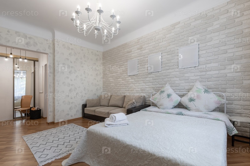 Просторная яркая спальня с стеной из белого кирпича и люстру
